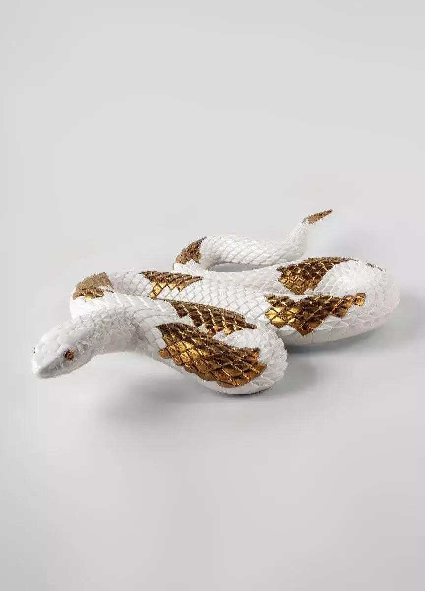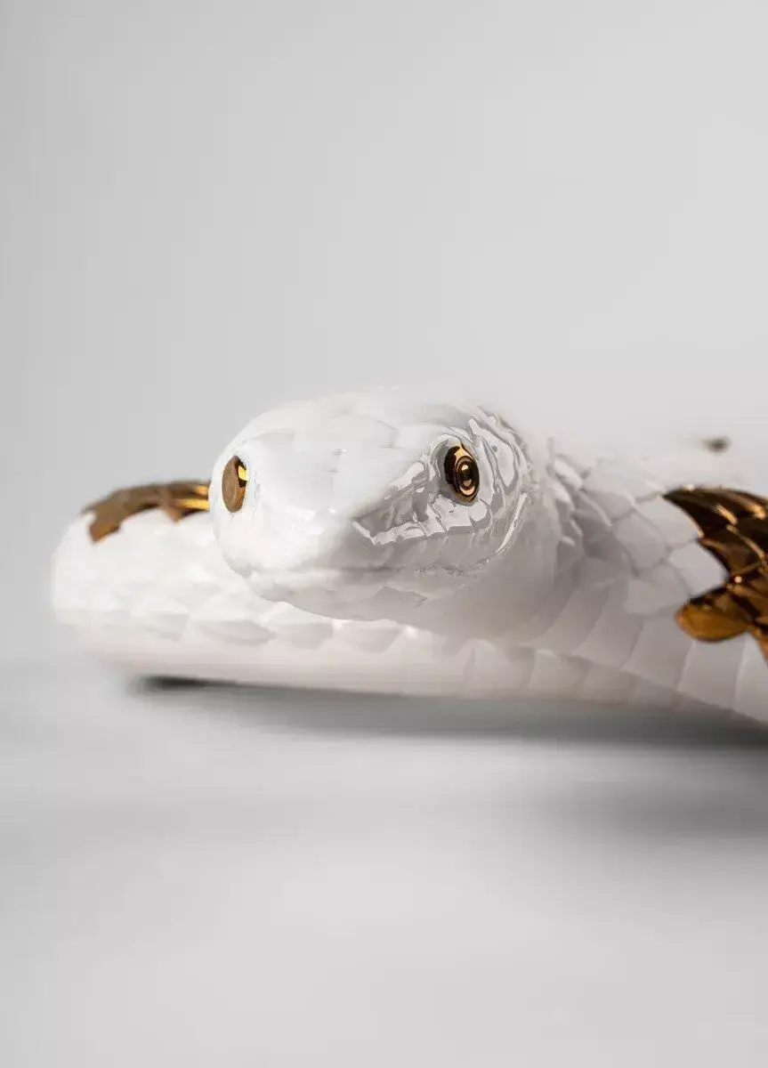 Тончайший фарфор, из которого выполнено тело змеи, позволяет передать каждый изгиб, каждый элемент пластики. Медные акценты добавляют тёплое свечение и глубину, создавая впечатление, что змея находится в движении.