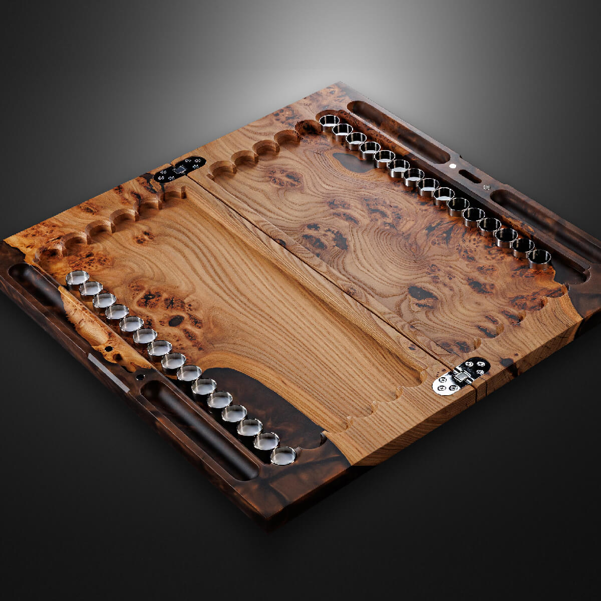 Цельный слэб карагача, отборный по текстуре и цвету. Прочная, кристально чистая эпоксидная смола. Магнитные замки, фурнитура — каждая деталь говорит о качестве.