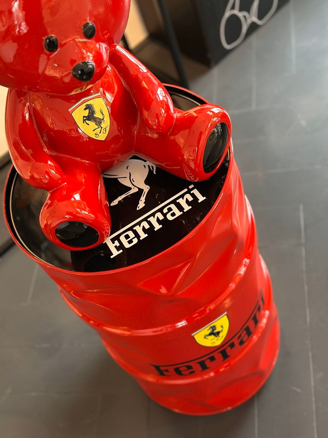 Девушка заказала арт-объект для мужа — медведь на бочке, стилизованной под Ferrari.